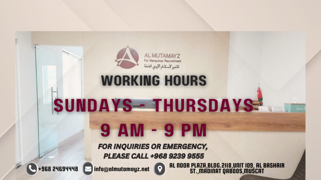Al Mutamayz staff are friendly and efficient. They are helpful to select your housemaid. I like in Al Mutamayz that they are not taking more than one month to receive your housemaid to Oman. Great job and good luck.